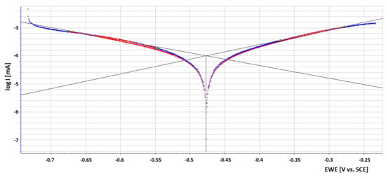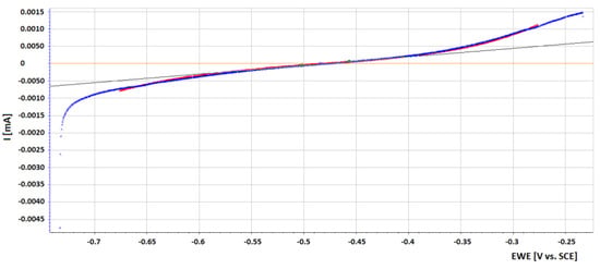Linear potentiodynamic polarization revealed polarization characteristics of the material in cathodic and anodic directions (Figure 13). The slope of the anode (ba) and cathode (bc) dependence was determined by Tafel (1st Stern) analysis. By determining the intersection of the tangents to the linear part of the Tafel curves, the corrosion potential of Ecorr and the corrosion current density of Icorr were found.