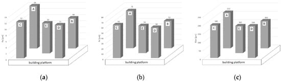 - in different position on the build platform, evaluated in particular direction-comparisons within samples A–E in the perpendicular direction and separate comparison within samples A–E in the parallel direction (analysis of variance (ANOVA), Tukey’s honest significant difference (HSD) test),