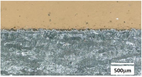 The measured roughness values correspond to the values found by Sidambe [], although he uses the spatial parameters (Sa) instead of profile parameters (Ra), and correspond also to the values given in []. Sidambe also notes that horizontally oriented surfaces have lower roughness values than inclined surfaces. The highest roughness is usually detected on vertical surfaces that contain a quantity of partially melted particles as a result of minimum exposure to the electron beam as a consequence of orientation. We also observed this in the preparation of metallographic sections (Figure 17). Reference [] also notes the lower surface roughness produced by DMLS compared to EBM (electron beam melting).