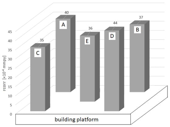 Figure 18 shows rcorr in particular positions on the build platform. It ranges from 3.5–4.4 × 10−3 mmpy, which are very small values. Noticeable differences in the corrosion rate of as-built material in individual sectors on the plate were not observed.