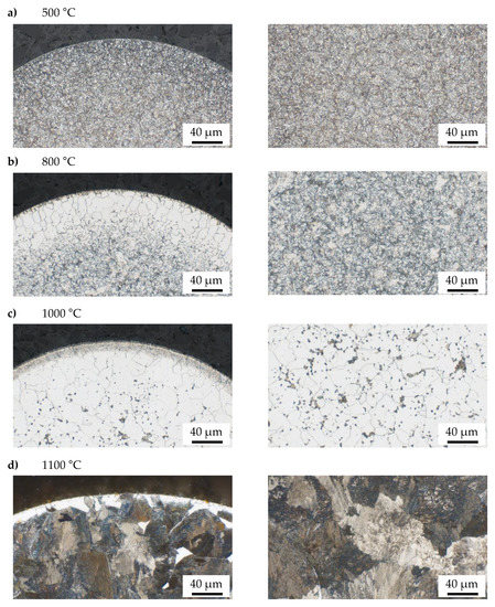 Microstructure of the microsamples near the surface (left) and in the middle of the sample (right) after the heat-treatment at (a) 500 °C, (b) 800 °C, (c) 1000 °C and (d) 1100 °C; etched 25–30 s in 3% alcoholic HNO3, equatorial cut.