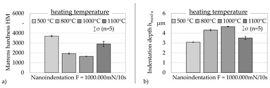 The tempered martensite present for the state heat-treated at 500 °C has the highest elastic deformation work and the highest elastic indentation modulus. The plastic deformation work is correspondingly the lowest in comparison to the considered heat-treatment states. This is similar for the mainly pearlitic microstructure, which is present in the particles heat-treated at 1100 °C. Here, too, the elastic part of the deformation work, as well as the elastic indentation work, are higher and the plastic part of the deformation work is lower than in the case of the particles that have been heat-treated at 800 °C and 1000 °C. With the help of microhardness measurements, the Martens hardness of the individual DSC states could also be determined. As shown in Figure 4a, the heat-treatment with the lowest heating temperature is associated with the highest hardness. When the heating temperature drops, the hardness decreases first, before a higher value is visible again at 1100 °C. The maximum penetration depth, which was also determined, behaves contrary to the hardness (Figure 4b). The higher the measured hardness, the lower the maximum penetration depth is.