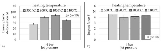 While the plastic deformation obtained investigating the different DSC-treated particles varies significantly when a constant jet pressure of ps = 4 bar is applied, the approximated impact force shows no significant variation, and confirms that particles of the same size have the same amount of kinetic energy when striking the contact plate. Average values (out of 10 measurements) obtained for the descriptor “linear plastic deformation” (a) and “impact force” (b) are shown in Figure 5. The error bars visualize the standard deviation calculated. Analyzing Figure 5, the following conclusions can be drawn: