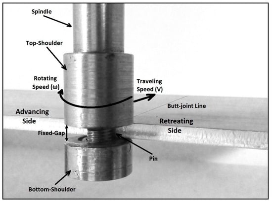 Bobbin friction stir welding (BFSW) is an innovative variant of the friction stir welding (FSW) process [], whereby a double-sided rotating tool physically ploughs along the interface of two butted plates [] without needing the backing anvil and the axial force during the process []. The dynamic interaction between the workpiece and the non-consuming tool creates a severe friction condition at the contact interface []. Consequently, significant heat is generated due friction which can locally soften the workpiece material sufficient for plastic yielding and stirring at the bonding track []. The stirring action arises from the rotation speed (ω) and advance speed (V). While the tool advances along the weld line (Figure 1), the mutual interaction of the speeds (ω, V) transports the softened mass from leading edge of the rotating tool to be deposited at the rear or trailing edge of the tool [].