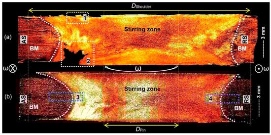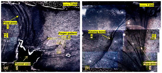 Photomontage microfeatures of the BFSW weld at the transverse cross-section (revealed by Reagent C). (a) AS border, (b) RS border. (1) flow-arms, (2) tunnel void, (3) finger patterns, and (4) kissing bond.