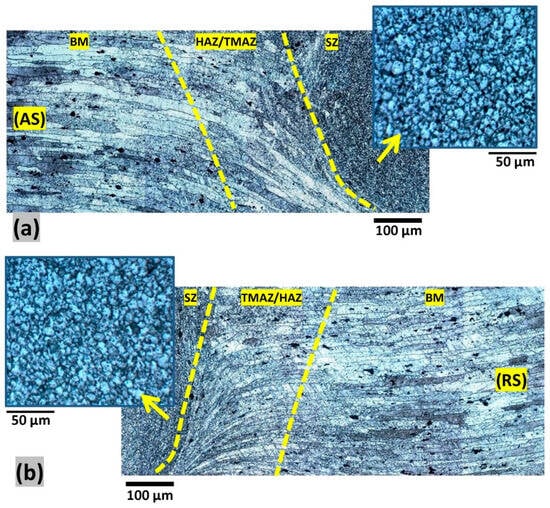 The side of the weld-seam where the direction of tool rotation is the same as the tool progress is called the advancing side (AS) and the opposite side of the weld-seam is the retreating side (RS) []. The region located between the AS and RS borders, named the stirring zone (SZ) [], experiences a thermomechanical plasticizing and then deposition and consolidation in the weld locus []. The adjacent region outside the SZ is called the Thermo-Mechanical Affected Zone (TMAZ). The microstructure of this region is formed by the stress-strain fields and heating flux which are induced by the friction and heat generation effects of the stirring action []. The next region between the TMAZ and the Base Metal (BM) is the Heat Affected Zone (HAZ). This region is exposed to thermal fields of the stirring process which alter the microstructure [].