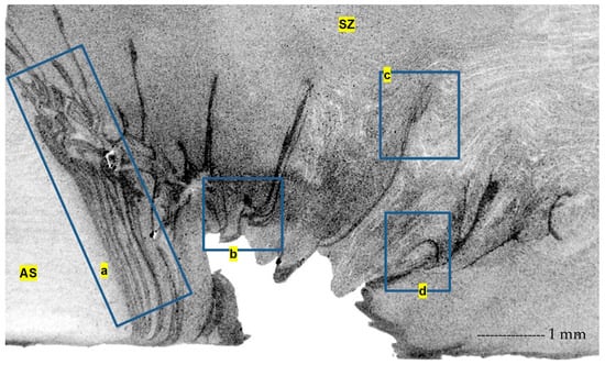 For this micro-flow evaluation, the sample of Figure 2a was chosen to reveal more details because of the existence of defects (e.g., tunnel void). As is shown in Figure 5a,b, the presence of the flow arms (banded patterns) is evident in the SZ at the hourglass borders for both sides of the weld. The flow arms of the AS are more compacted to each other.