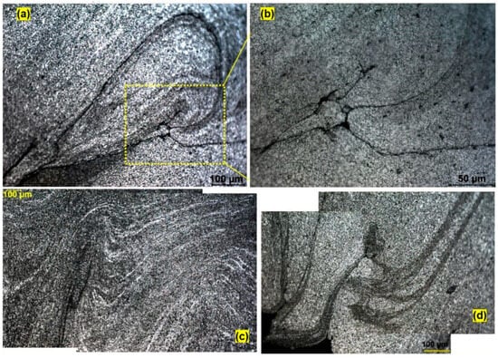 Another flow feature, the enlarged micro-flow shown in Figure 7d, reveals the hook line flow patterns positioned at the internal edge of the tunnel void. We interpret this feature as a lack of material consolidation during stirring, similar to the root flaw in CFSW.