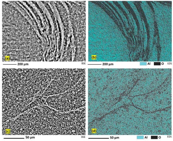 In general, the BSE imaging can be used to show the different elements present in the sample. The microscopic analysis of the flow-arms region in Figure 8a,b confirms that the elongated flow-arms are rich in oxygen. This region is delineated as the darker area at the OM etched samples. Additionally, the EDS analysis of the location of the hair-line micro-crack shows that the edge of the crack is rich in oxygen (Figure 8c,d).