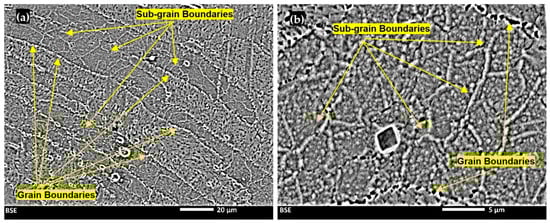 SEM analysis of the flow arm shaped branches at the RS. (a) A bunch of elongated grains at the position of the flow pattern, (b) higher magnification of the inside of the grain, representative of the high density of the sub-grain boundaries as a response to the stored strained during the DRX.