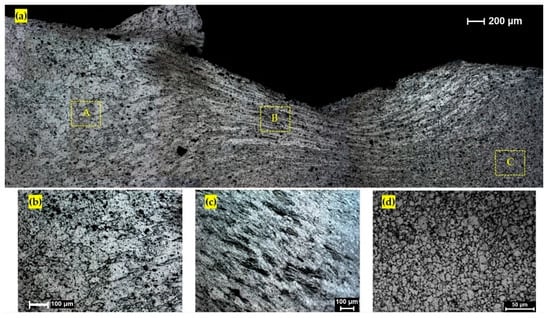 Grain and flow details of the sub-shoulder region of the weld crown (Reagent B). (a) macrograph of the sub-shoulder region; different microscopic features are enlarged as Regions A, B, C in Figure 10b–d, respectively; (b) Regions A; coarse grain structure, (c) Regions B; elongated grains, (d) Regions C; ultrafine grained microstructure.