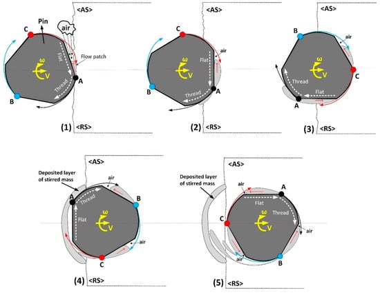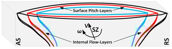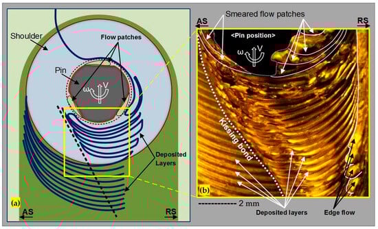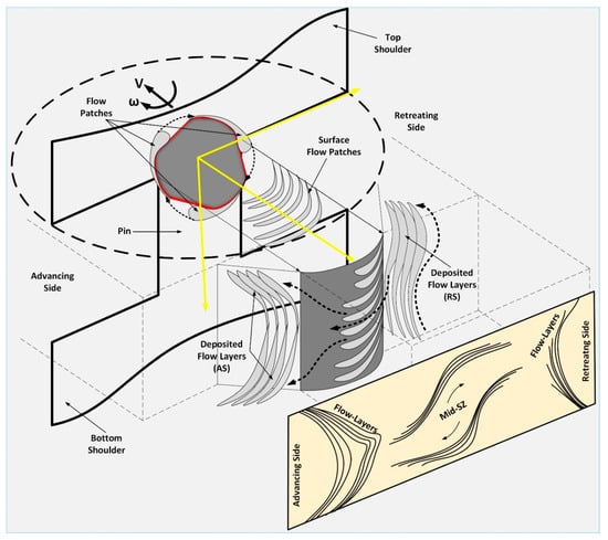 In Figure 15, the simultaneous formation of the surface flow patches (pitch layers) and the internal flow layers has been demonstrated as a discontinuous flow model for the plasticized batches of the mass which are formed by the revolution of the tool. As the shoulder action is directly responsible for the formation of the surface flow patches at the sub-shoulder region, the rotation and the advancement of the pin at the mid-SZ area generates the plasticized flow batches at the proximity of the tool, at the breadth of AS-RS. The deposited flow layers at the trailing edge of the tool form the bended flow layers at the borders of the AS and RS, which are revealed as the hourglass-boundaries within the cross-section of the weld.