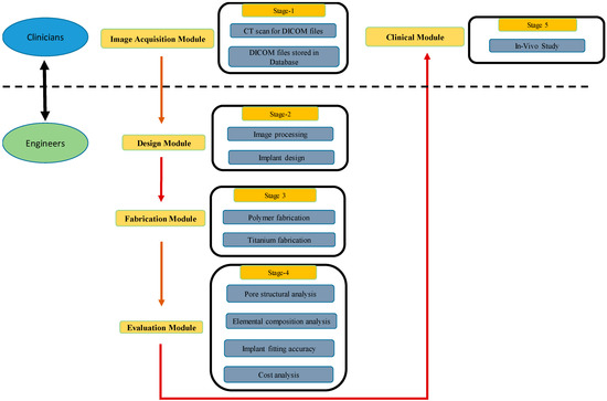 The flowchart in Figure 1 represents the research methodology comprising various stages and the interface between clinicians and engineers. The interface acts as a communication link to analyze and access the various aspects starting from the patient CT scan to final clinical analysis. The communication interface helps in improving the implant design, reducing clinical errors, and providing satisfaction to the patient.