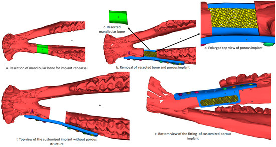 The two designed reconstruction plates of STL (Standard Tessellation Language) files were virtually assembled and aligned with the goat mandible for fitting and rehearsal purposes. A small mandibular section (colored green) was resected (Figure 3a,c) and a customized porous plate was assembled (Figure 3b,d,e) to verify the design. Similarly, the plate without porous structure was also analyzed (Figure 3f) and was found to be in an exact fit without any deviation from the mandible region. Both reconstruction plates aligned well with the mandibular bone, thus satisfying the assembly and rehearsal evaluation.