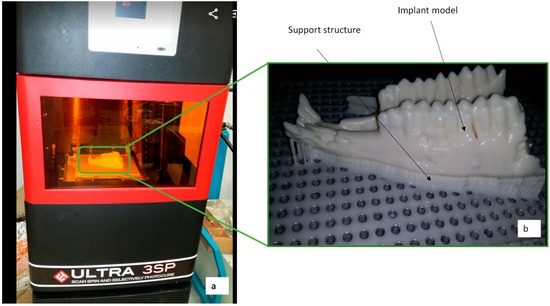 Figure 4. (a) Ultra 3SP 3D printer used for the polymer fabrication of (b) goat mandible.