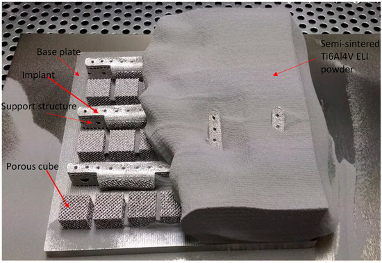 Figure 5 illustrates the EBM-fabricated goat implants with support structures and porous cubes. The support structures were added to remove the dissipated heat from the build and to assist the overhang structures. The time taken for the entire build cycle was approximately 6–8 h. The EBM-built parts were subjected to a powder recovery system (PRS) to remove the semi-sintered powder attached to the build parts. The support structures attached to the implant were easily removed manually with plyers without having any adverse effect on the implants or their parts. The porous cubes were fabricated to study the inner construction of the pore channels. The cubes were designed similar to the pore structure of the goat implant.