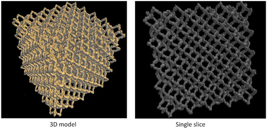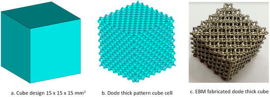 Upon completion of the EBM build, it is a usual practice to blast the semi-sintered powder attached to the build specimen. Blasting is done with a mixture of the same Ti6Al4V ELI powder and highly pressurized air. There are high chances of breakage of the internal pores in the case of porous structures. Pore structural analysis was conducted to analyze the internal connectivity through micro-CT scan analysis. Weak interconnectivity leads to fractures and a good pore channel enhances the implant–tissue ingrowth. A good interconnected pore channel not only offers a corridor for micronutrients but also provides a higher surface area for implant–tissue ingrowth [23]. A solid cube of 15 mm × 15 mm was designed (Figure 6a) and patterned to the porous structure (Figure 6b) using a dode thick cell type of Magics structural module (Materialise, NV, Leuven, Belgium). The dode thick porous structure was then fabricated using the EBM machine as shown in Figure 6c. Bruker Skycam 1173 (Bruker, Billerica, MA, USA) micro-CT scanner was used to visualize the internal defects of the EBM-fabricated porous cube. An accelerating source voltage of 120 kV was used in this study. A high-resolution X-ray beam with a focused spot size of 5 µm was concentrated on the porous cube.