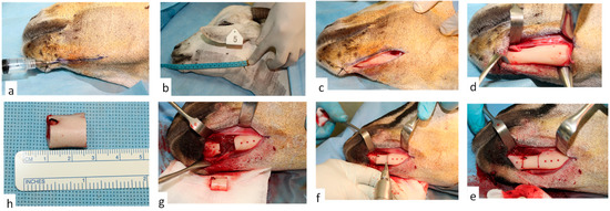 Three study groups of goats were formed for the clinical study of these reconstruction plates. The groupings were done depending on the type of reconstruction plates implanted into the animal to treat the surgical defect. Group 1 was where the mandibular segmental defect was treated with an EBM reconstruction plate with mesh, whereas Group 2 was treated with an EBM reconstruction plate without mesh and Group 3 contained animals with the commercial plate. A total of 15 animals were ear-tagged with numbers and assessed for their oral intake. The weights and physical condition were recorded. The animals were made to fast for 12 h before surgery. General anesthesia (GA) was performed by intramuscular injection of drugs, namely acepromazine (1.5 mg/kg, Vedco, St. Joseph, MO, USA), ketamine (20 mg/kg, Sigma Chemical, St. Louis, MO, USA), and xylazine (5 mg/kg, Lloyd Laboratories, Shenandoah, IA, USA). After GA, the surgical site over the mandible was shaved and disinfected (Figure 7a, and the mandible length was measured from angle to symphysis (Figure 7b). A small linear incision (Figure 7c) was performed on the skin of the lower mandible jaw using a Bard–Parker blade (Size-15). The incision was extended (Figure 7d) to expose the edentulous area in the parasymphysis of the left mandible. An experimental segmental defect was marked and created in this edentulous area (Figure 7e). The reconstruction plates and screws were aligned on the mandibular body region for marking of pilot screw holes. The osteotomy was performed using a small reciprocating saw under saline irrigation (Figure 7f). The segmental bony segment was removed (Figure 7g,h) and the wound was cleaned and irrigated with saline.