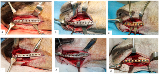 Figure 8. Three different reconstruction plates fixed with screws (df) on the previous marked segmental defect margins and screw holes (ac).
