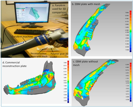 The different reconstruction plates, including customized EBM plates without mesh, customized EBM plates with mesh, and commercial plates, were investigated for accurate fitting. Accuracy analysis was performed to approximate the gap between the implant and the mandible and to quantify the aesthetics quality and the outer profile of the facial skeleton. Since there are no standard tests available for accuracy evaluation, in this work, a two-stage methodology was adopted to compare and validate the performance of three designs. Initially, all the 15 goats’ 3D models obtained from CT scan before surgery were taken as reference data models. In the first stage (pre-operative), the implants in three different groups were analyzed using the Faro Arm scanner and 3D comparison by fitting them on additively fabricated goat mandibles (polymer). The obtained 3D models generated from the Faro Arm scanner were then aligned and superimposed with the reference 3D model to analyze the deviation. In the second stage (post-surgery), the CBCT scans of goat heads were processed and 3D models were generated using Mimics®. The generated 3D models post-surgery were then superimposed on the 3D models of pre-surgery to analyze the deviation. A 3D modeling tool (Geomagics Control 2014, 3D systems, Rock hill, SC, USA) was used to align the data sets and analyze the deviation [24]. The statistical indices employed to measure the accuracy of the implants were the root mean square error (RMSE) and the mean absolute error (MAE) as shown in Equations (1) and (2), respectively. The MAE represents the mean of the absolute values of the individual errors on overall points in the test set (remodeled face with implant). Likewise, the RMSE value (i.e., the square root of the average of squared errors) provides the average magnitude of the error to quantify the overall accuracy for the remodeled goat mandible. These two indices have been used to diagnose and validate the fitting accuracy as well as to determine the variation among the different designs of the implant.