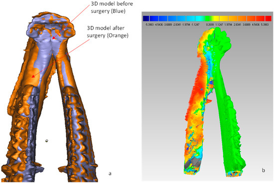 Figure 10. (a) The alignment of 3D models before and after surgery and (b) the computed surface deviation test results of a reconstruction mesh plate.