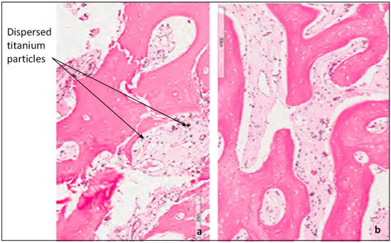 Figure 13. Histological analysis of specimens showing (a) mild inflammatory and sub-micrometer particles of dispersed material within the bone and (b) islands of newly formed cancellous bone and neovascularization interspersed with the connecting tissue.