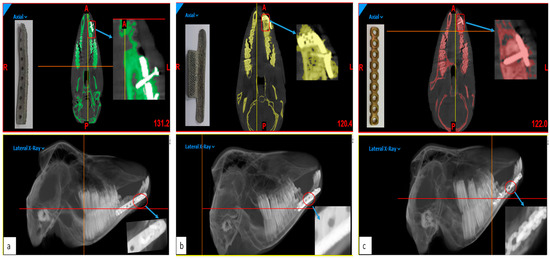 Figure 14. The healed segmental defects of three different goats with (a) reconstruction plate without mesh, (b) reconstruction plate with mesh and (c) synthesis commercial plate after 3 months post-surgery (arrows indicating the titanium plates filling the defects).