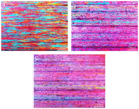 Figure 1 shows the longitudinal section microstructure of Al-0.25Fe-0.1Cu-0.1La alloys with different Si content. Due to the rolling force during the rolling process, the grains are shown along the rolling direction. We could observe that the Si-containing alloys had uniform grain size distribution and finer grain size compared to the matrix alloy without Si element, and the average grain size obtained by using Image Pro Plus (IPP6.0, Media Cybernetics, Washington D.C., USA) software are 43.87 μm (0 wt.% Si), 16.66 μm (0.1 wt.% Si), 19.01 μm (0.2 wt.% Si), indicating that trace of Si element can promote the grain refinement of the aluminum [10]. This also implied that alloys with Si element may have better mechanical properties. Simultaneously, as the grain size decreased the number of grain boundaries increased, which caused an increase of electron scattering, which adversely affected the electrical conductivity of the alloy. Although the grain boundary was a factor affecting the conductivity of aluminum alloy, grain boundaries had less influence on the conductivity. In this experiment, it was also well verified that the conductivity of 0.1 wt.% Si-containing alloy (57.01% International Annealed Copper Standard (IACS)) and 0.2 wt.% Si-containing alloy (58.45% IACS) is slightly lower than that of Si-free alloy (60.45% IACS) at 25 °C.