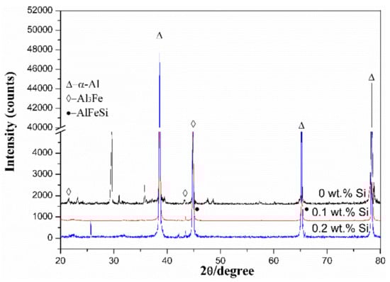 Figure 2 shows XRD patterns of Al-0.25Fe-0.1Cu-0.1La alloys with different Si content. We could find that the α-Al matrix and Al3Fe phase [11] are present in the alloys. This indicated that the commonly dispersed phase such as Al3Fe phase cannot be completely dissolved in the α-Al matrix during the smelting rolling process [12]. Due to the very low solid solubility of the Fe element in the aluminum matrix, it is mainly in the form of second phase intermetallic particles. The phase diagram of Al-Fe shows the maximum solubility of about 0.04 wt.% at 655 °C. Under equilibrium conditions, supersaturated Fe will exist as Al3Fe phase. Usually, we could observe the most intense Al peak at 38 degrees. Compared to the Si-free alloy, we could find the new phase of AlFeSi in the Si-containing alloy. The possible reason is that the growth free energy of the AlFeSi ternary phase was lower than that of the AlFe binary phase [13,14,15]. Therefore, the addition of Si element can significantly reduce the free energy of the whole system, and the AlFe binary phase tends to shift to the AlFeSi ternary phase.