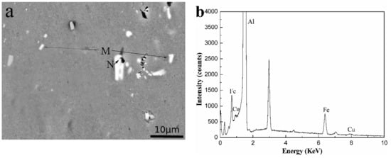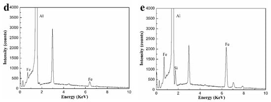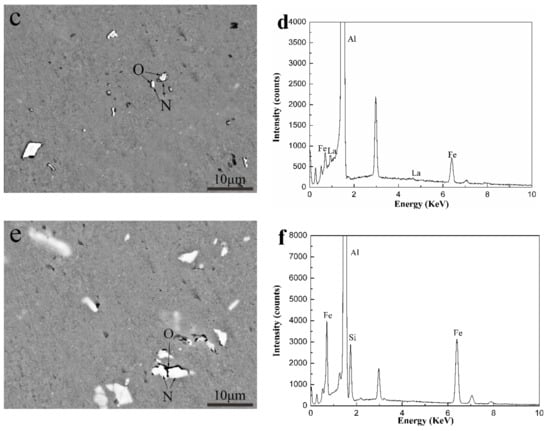 In Figure 3 we can see the gray α-Al matrix, white particles of different shapes, including the tightness of the sphere, the rod shape and the irregularity in the three kinds of alloys. Combined with the experimental results of XRD and EDS, in Figure 3, phase M was identified as the AlFeCu [16] phase, phases N was confirmed to be the AlFeLa [17,18] phase, and phase O was determined as the AlFeSi phase. As shown in Figure 3, we could see that due to the addition of Si, the bright white near rod-shaped AlFeLa phases disappears. This might suggest that AlFeLa (Figure 3a), which was bright white near rod-shaped, tends to transition to the pale white irregular AlFeLa (Figure 3c,e). The difference in color appearance of the two kinds of AlFeLa and AlFeSi phases was caused by the alloying of the higher atomic number La, which provides a simple method for distinguishing the two phases. We observe that the AlFeSi phase tends to form around the AlFeLa phase. This might promote the spheroidization of AlFeLa phase. As a result, it might be beneficial for the second phase strengthening.
