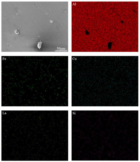 Figure 4 shows the EDS mapping of Al, Fe, Cu, La, Si elements of Al-0.25Fe-0.1Cu-0.1La-0.1Si alloy. It can be seen that the black AlFeSi phase tended to be dispersed around the white AlFeLa phase. The establishment of the black-white duplex phase indicated that the AlFeLa phase acted as a favorable nucleation site for the AlFeSi phase. The nucleation and growth process of the AlFeSi phase could be described as follows. First, the AlFeSi phase nucleated on the surface of the AlFeLa phase during solidification and then the AlFeSi phase grew along the surface of the AlFeLa phase. The AlFeSi phase grew around AlFeLa phase to form the core/shell structure similar to the core/shell structure of Ce-containing aluminum alloys [19]. As a result, the growth of the AlFeLa phase could be suppressed and the size of the precipitate could be refined in the Si-containing alloy. It is well known that the formation of large compounds not only reduced the strength but also adversely affected fatigue and impact toughness. At the same time, the finely distributed phase inhibited recrystallization, while the coarsely distributed phase promoted recrystallization.