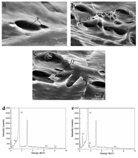 Room temperature tensile fracture of the Al-0.25Fe-0.1Cu-0.1La alloys with different Si contents: (a) 0 wt.%; (b) 0.1 wt.%; (c) 0.2 wt.%, (d) and (e) are EDS pattern of the AlFeCu particle (P), AlFeSi particle (Q).