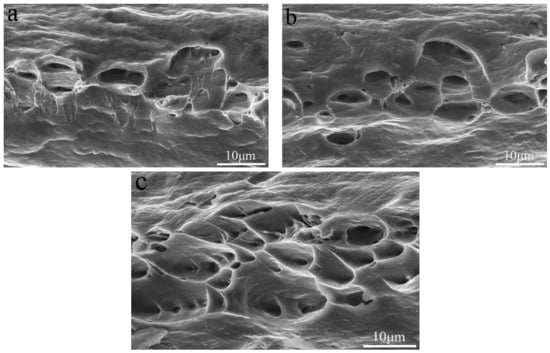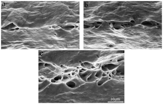 Tensile fracture of the 0.1 wt.% Si-containing alloy tested at (a) −20 °C, (b) 25 °C and (c) 50 °C.