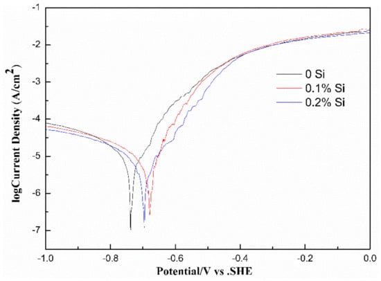 Figure 8 shows Tafel polarization curves of the three kinds of alloys tested in 3.5 wt.% NaCl solution. The corrosion potential () and corrosion current density () obtained by analyzing the Tafel polarization curve are shown in Table 2 [21]. The polarization curves of the three alloys exhibited similar shapes. A low corrosion potential implied that the alloy was more susceptible to corrosion and a high corrosion current density means faster alloy corrosion processes [22]. Combined with the results of Table 2, it can infer that, with the addition of the Si element, the Si-containing alloy had a higher corrosion potential and lower corrosion current density than that of the Si-free alloy. It was obvious that the addition of Si improved the corrosion resistance of the Al-Fe-Cu-La alloy.