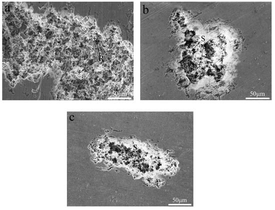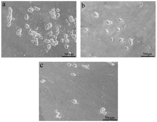 The corrosion resistance of the present alloys depended on the passivation film and its ability to self-heal after the passivation film was broken. The destruction of the passivation film was likely to occur at the microdefects of the alloy. During the etching process, intermetallic particles resulted in the potential difference between the second phase particles and the α-Al matrix in the present alloys. When the alloys were exposed to a solution containing chloride ions, these second phase particles may have caused localized erosion and enhanced the sensitivity of the alloy to pitting. Figure 9 and Figure 10 present corrosion surface images of the alloys in 3.5 wt.% NaCl solution. It was obvious that the alloys corrosion was in the form of aluminum alloy pitting. Pits with similar morphology were observed on the surface of three alloys. Compared to the Si-containing alloy, Si-free alloy had more pits and the larger pitting area. This further confirmed that the corrosion resistance of the alloys improved with the addition of Si. Combined with EDS analysis, we can find that the residual substance in the pit was the Fe-containing phase (see the R and S regions of Figure 10) [23]. The presence of Fe-containing intermetallic compound particles adversely affected corrosion resistance, since the Fe-rich phase was the catalytic site for the cathodic reaction and the site for pit nucleation [24,25].