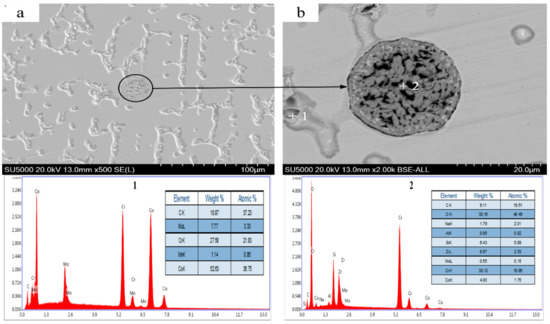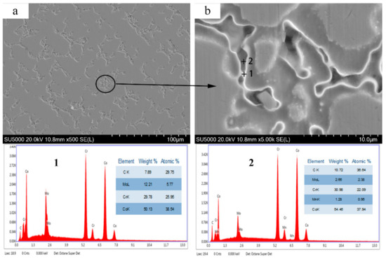 Further analysis of the microstructure of the alloys revealed that the metallographic structure of a single-channel scanned CoCr alloy specimen was composed of austenite and a carbide-like structure (Figure 4a). Its crystal structure was crystalline and columnar, with carbides distributed in the grain boundaries, and agglomeration occurred in the internal structure of the material (Figure 4b). The microstructures consisted of a Co-based solid solution and an agglomerated second phase, which was shown by XRD analysis to be a carbide phase. Based on the energy-dispersive X-ray spectroscopy (EDS) results, it was speculated that one area was a Mo-rich M6C carbide and reticular in shape, while another area was a Cr-rich M23C6-type carbide (mainly Cr23C6 as shown in Figure 4b, points 1 and 2).
