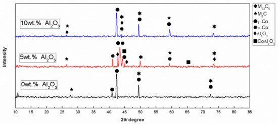 The XRD data were further analyzed, and it was observed that the main phase did not change substantially after Al2O3 addition, but the Al2O3 phase was identified. The main peak in the γ-Co diffraction spectrum shifted upon the addition of Al2O3, which, according to Bragg’s Law, is attributed to structural changes in the unit cell that cause a change in the diffraction peak positions. This shows that the interplanar spacing and lattice constant decreased, which would affect the deformation performance of the powder.