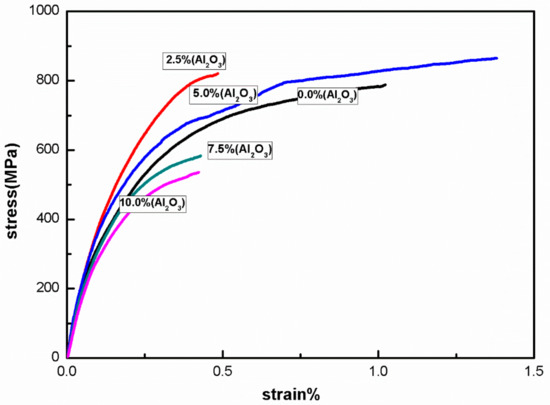 Stress–strain curves of CoCr alloy doped with different percentages of Al2O3.