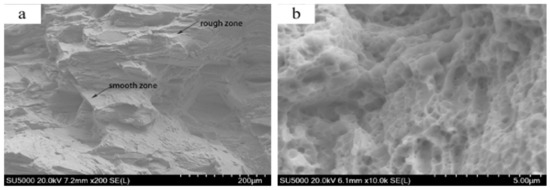 Micrographs of fracture surfaces of tensile specimens containing 5% Al2O3: (a) fracture surface of tensile specimens and (b) the magnified fracture surface in Figure 15a.