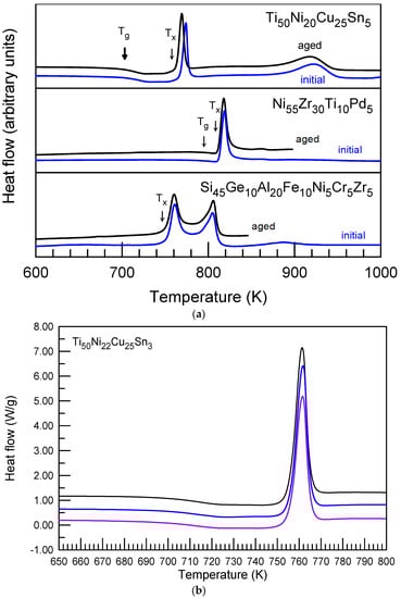 - Louzguine, D.V.; Inoue, A. Comparison of the long-term thermal stability of various metallic glasses under continuous heating. Scr. Mater. 2002, 47, 887–891. [Google Scholar] [CrossRef]