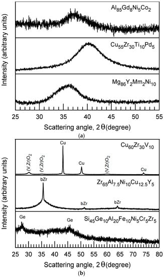 - Louzguine, D.V.; Inoue, A. Microstructure and properties of melt-spun Si-Al-Ge-Transition Metal amorphous alloys containing nanocrystalline Ge particles. Mater. Trans., JIM 1998, 39, 245–251. [Google Scholar] [CrossRef]