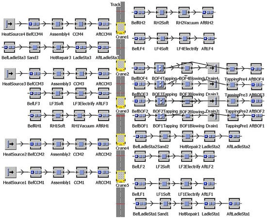 - Yu, S.P.; Lv, R.X.; Zheng, B.L.; Chai, T.Y. Simulation system for logistics in steelmaking process based on flexsim. In Proceedings of the 2009 Chinese Control and Decision Conference, Guilin, China, 17–19 June 2009; IEEE Computer Society: Washington, DC, USA, 2009; pp. 3741–3746. [Google Scholar]