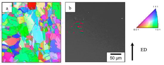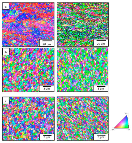 TSL OIM EDAX v.7 (EDAX Inc., Draper, UT, USA) software was used for indexing the EBSD patterns. The dimension of the scan areas was 20 × 20 µm. OIM maps were collected from transverse (shear plane) and longitudinal sections of the samples. They were collected at the sample’s center (~0.5 mm from the sample axis), at the middle-radius (~2.7 mm from the sample axis), and at the sample’s edge (~4.5 mm from the sample axis). Scan step was 0.1 µm for the initial state and at the central area of the deformed samples, and 0.05 µm at the mid-radius and edge of the HPTE samples.