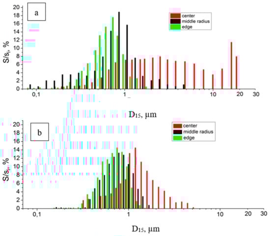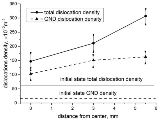 Figure 6c). This fact suggests that the multiplication rate of SSD was higher than their recovery/annihilation rate at the edge (also in the mid-radius) area, compared to the kinetics of the same processes in the central area. The difference in density for both kinds of dislocations (GND and SSD) is consistent with the published data [