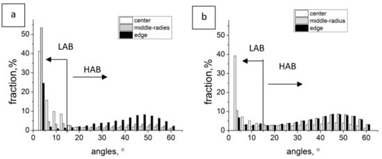Figure 6d clearly demonstrate that in all sample areas, the microstructure is complex, i.e., the LABs and HABs represent an interpenetrated network. In other words, a crystallite (grain or subgrain) can be simultaneously bounded by high angle and low angle boundaries. Interestingly, the density of SSD showed an enhanced increase at the edge of the HPTE-processed sample in comparison with that of GND (