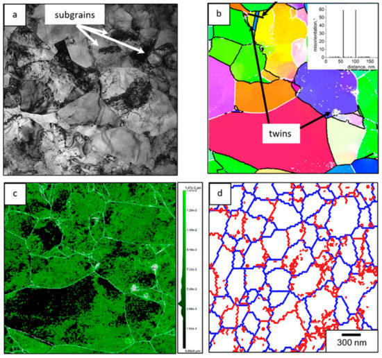 0 is the friction stress, k is a constant, and d is the mean grain size in the corresponding sample area. The sample contained material from central and mid-radius areas. The microstructure in both areas is complex because the grains are bounded by both HABs and LABs. Therefore, it is not clear which GB misorientation threshold and grain size should be used in Equation (3). Prior in-situ TEM study [