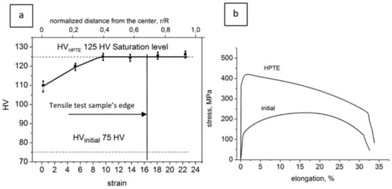 Figure 8b). A rapid strengthening and a short uniform elongation range characterized the stress–elongation curve of copper after HPTE. A decrease of uniform elongation from ~16% in the annealed state to ~2% after the HPTE deformation is a typical behavior for the materials produced by SPD methods. However, as the deformation is localized, the elongation to fracture reaches 30%, which is two times higher than post-necking elongation of the annealed copper (