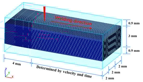 The commercial CFD software Flow 3D was adopted as the platform, based on which the user subroutines were developed using Fortran language. Figure 3 shows the computational region and mesh constructed, of which the length can be adjusted for different process parameters. The mesh needs to be long enough to reach a quasi-stable state for the weld pool, when the length and width do not increase notably with time any more. To increase the computation speed, a non-uniform mesh was used: the weld zone had finer mesh division while the region away from the weld had coarser mesh. The minimum mesh cell was 0.1 mm × 0.1 mm × 0.15 mm. The mesh was fine enough to capture the influence of the heat source model on the keyhole and weld pool behavior, while it was not too fine to make the computation time impractically long. The void elements were used to model the vapor zone, which was assumed as a boundary with uniform pressure and temperature. The volume of fluid (VOF) method was used to trace the free surface of the molten pool.