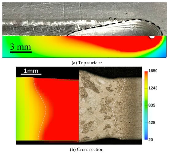 Comparison of the numerically predicted and the experimentally obtained weld pool profiles on the top surface (a) and cross section (b) for laser welding of Ti6Al4V under the flat welding position (4.0 kW, 25 mm/s).