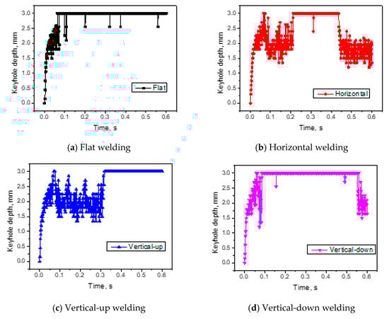 The variations of keyhole depths with time are presented in Figure 5 for laser welding under four welding positions and with the small heat input 85.7 J/mm (laser power 3.0 kW, welding speed 35 mm/s).